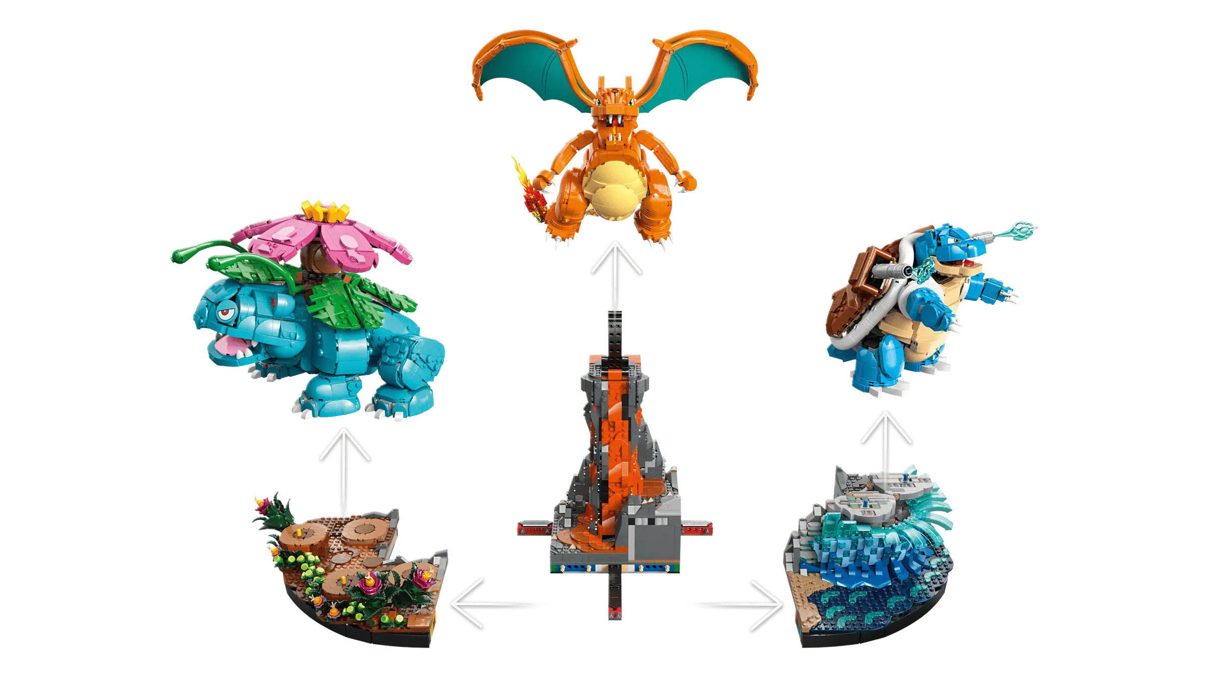 - 3 FIGURKY IKONICKÝCH POKÉMONŮ – Tato propracovaná stavebnice obsahuje 3 pohyblivé figurky Pokémonů z oblasti Kanto v jejich nejnovějších a nejmocnějších podobách, které jsou umístěny na podstavcích s motivem pláže, džungle a sopky